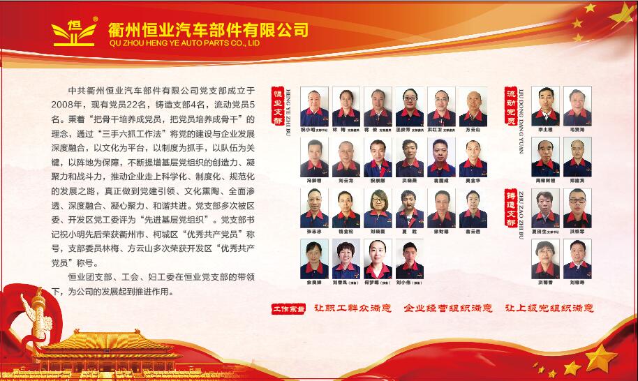中共衢州17C.COM汽衢州17C.COM(yè)汽車部件有限公司黨支部成立於2008年,現有(yǒu)黨員24名(míng),鑄造支部4名,流動黨員5名。秉著“把骨幹(gàn)培養成(chéng)黨員(yuán),把黨員培養(yǎng)成骨幹”的理念,通過“三手六(liù)爪工作法將黨的建設與企業發展深度融合,以(yǐ)文化為平台,以製度為抓手,以隊伍為關鍵,以陣(zhèn)地為保(bǎo)障,不斷(duàn)提增基(jī)層黨組織的創造力、凝聚力(lì)和戰鬥力,推動企業走上科學化、製度化、規範化的發展之路,真正做到黨(dǎng)建引領(lǐng)、文化(huà)熏陶、全麵滲透、深度融合(hé)、凝心聚力、和諧(xié)共進。黨支部多次被區委、開(kāi)發區黨工委評為“先進基層黨組織”。黨支部書記祝小明榮獲衢州市、柯城(chéng)區“優秀黨務(wù)工作者”稱號,支部委員林梅、方雲山、錢(qián)金鬆、蔣俊等榮獲(huò)開發區“優(yōu)秀共產黨員”稱號。黨(dǎng)員徐財德、祝崇剛多(duō)次獲得市級職業技能(néng)大賽優異成(chéng)績,恒(héng)業的技師團隊也全部來自支部黨員。